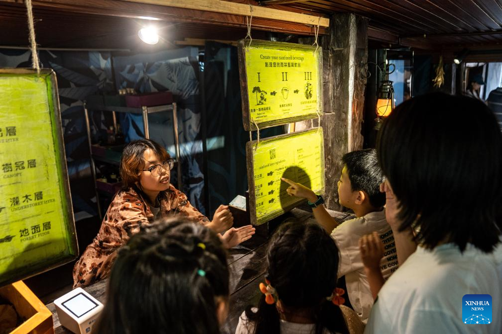 This photo taken on July 20, 2023 shows a library at the Banli Village of Lancang Lahu Autonomous County, southwest China's Yunnan Province. In recent years, Lancang Lahu Autonomous County has harnessed its rich cultural and tourism resources, promoting high-quality integration of culture and tourism through industrial linkage and improving service systems. According to statistics, the county received over 3 million tourists from January to May in 2023, generating a comprehensive tourism revenue of 3.388 billion Yuan (about 0.47 billion U.S. dollars). (Xinhua/Hu Chao)