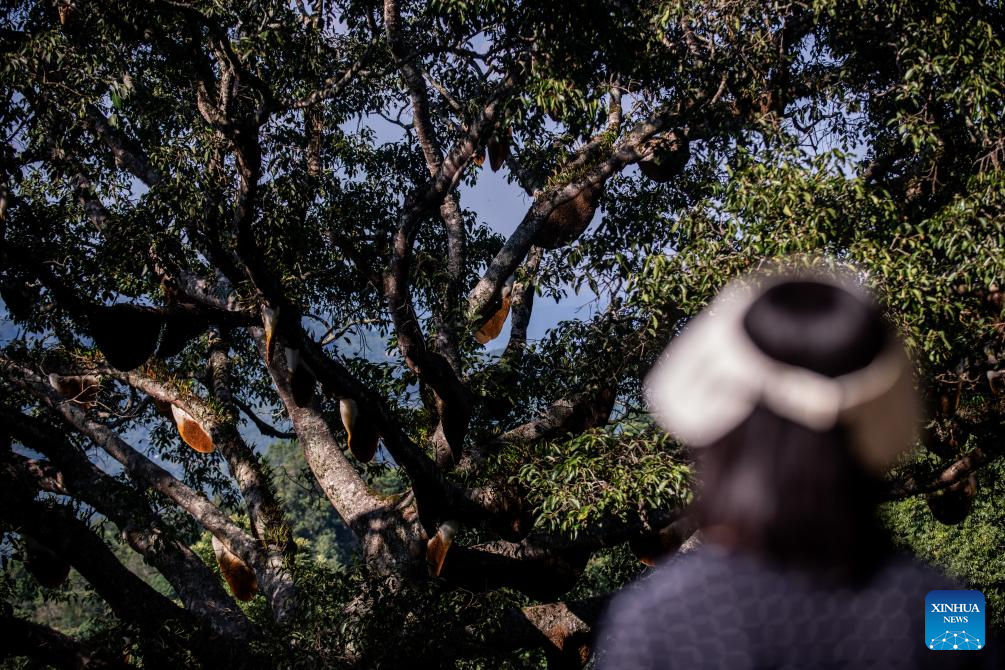 A tourist visits a banyan tree with dozens of beehives at the Jingmai Mountain in Lancang Lahu Autonomous County, southwest China's Yunnan Province, July 18, 2023. In recent years, Lancang Lahu Autonomous County has harnessed its rich cultural and tourism resources, promoting high-quality integration of culture and tourism through industrial linkage and improving service systems. According to statistics, the county received over 3 million tourists from January to May in 2023, generating a comprehensive tourism revenue of 3.388 billion Yuan (about 0.47 billion U.S. dollars). (Xinhua/Hu Chao)