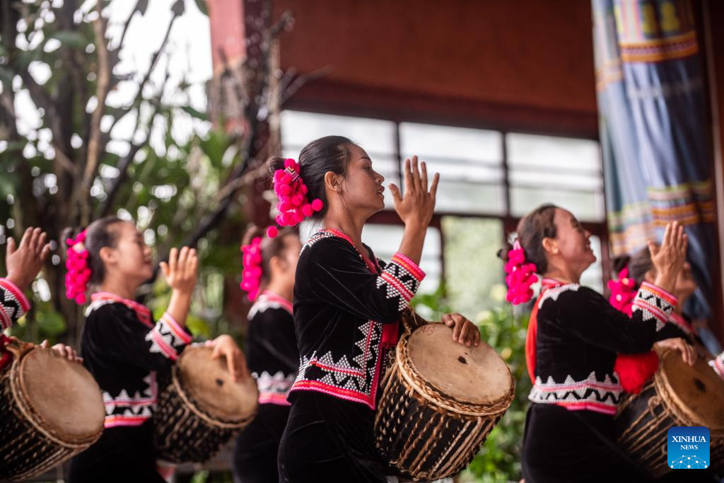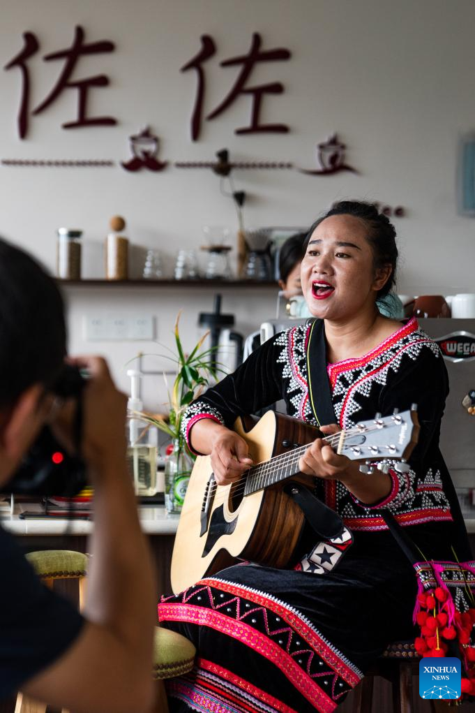 Villager Guo Yulan sings an original song at Banli Village of Lancang Lahu Autonomous County, southwest China's Yunnan Province, July 20, 2023. In recent years, Lancang Lahu Autonomous County has harnessed its rich cultural and tourism resources, promoting high-quality integration of culture and tourism through industrial linkage and improving service systems. According to statistics, the county received over 3 million tourists from January to May in 2023, generating a comprehensive tourism revenue of 3.388 billion Yuan (about 0.47 billion U.S. dollars). (Xinhua/Hu Chao)