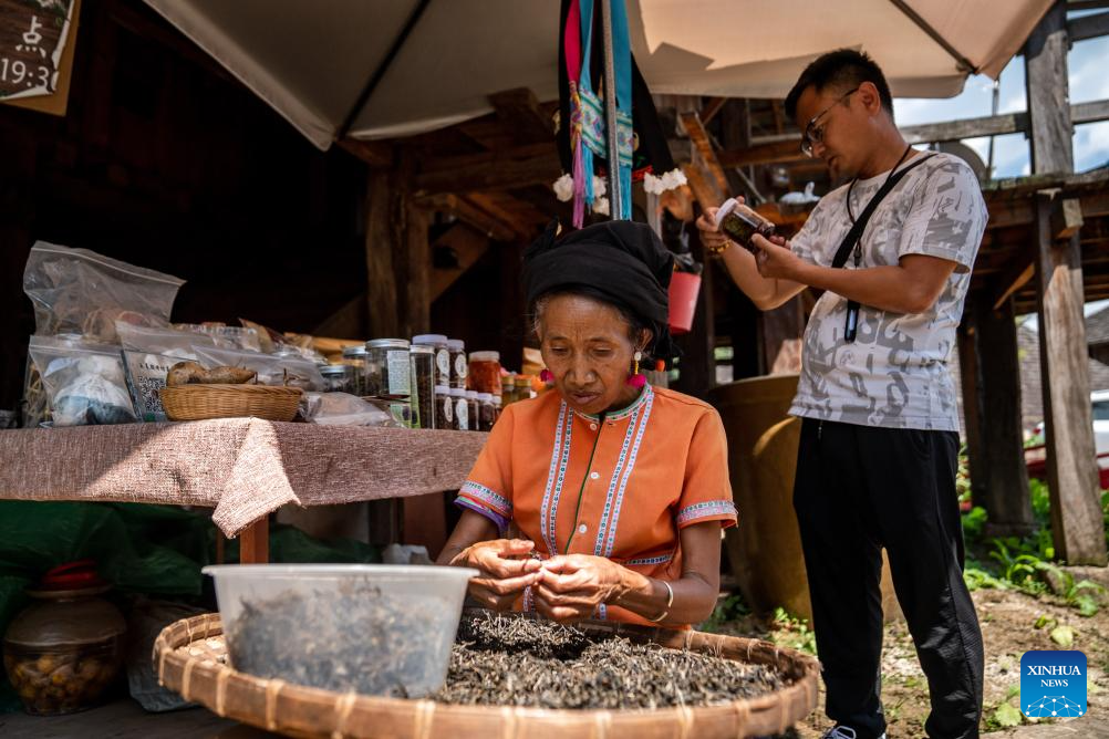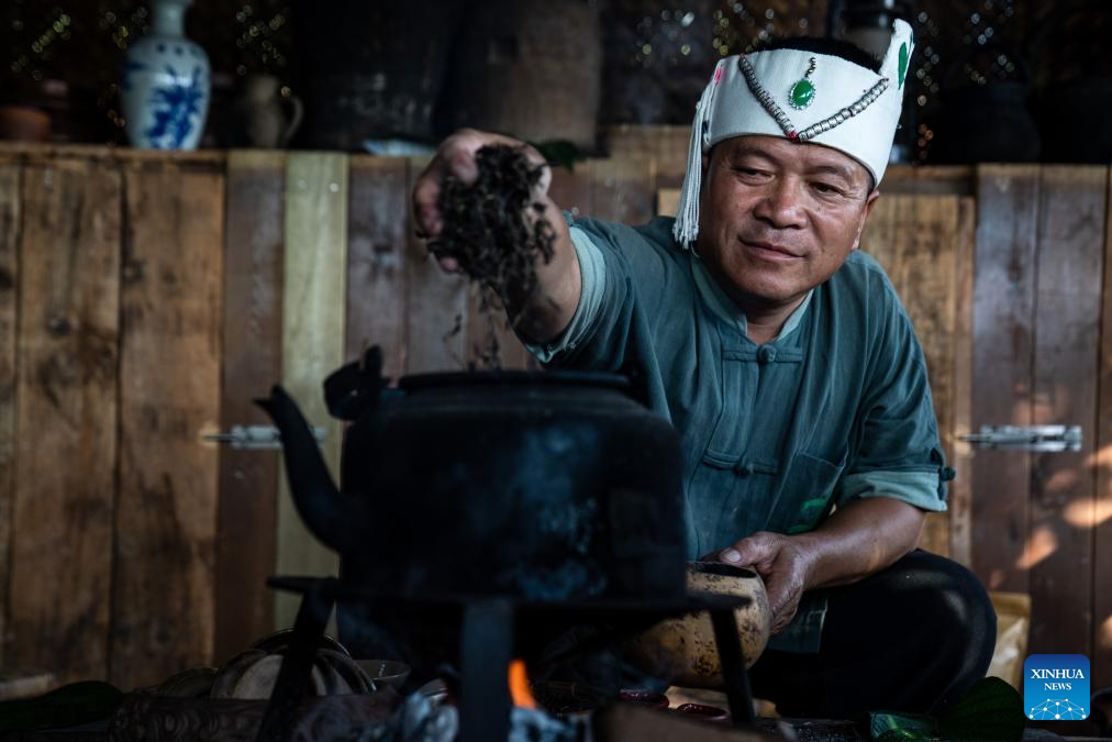 Tea grower Nan Kang of Blang ethnic group makes tea at Huimin Township of Lancang Lahu Autonomous County, southwest China's Yunnan Province, July 18, 2023. In recent years, Lancang Lahu Autonomous County has harnessed its rich cultural and tourism resources, promoting high-quality integration of culture and tourism through industrial linkage and improving service systems. According to statistics, the county received over 3 million tourists from January to May in 2023, generating a comprehensive tourism revenue of 3.388 billion Yuan (about 0.47 billion U.S. dollars). (Xinhua/Hu Chao)