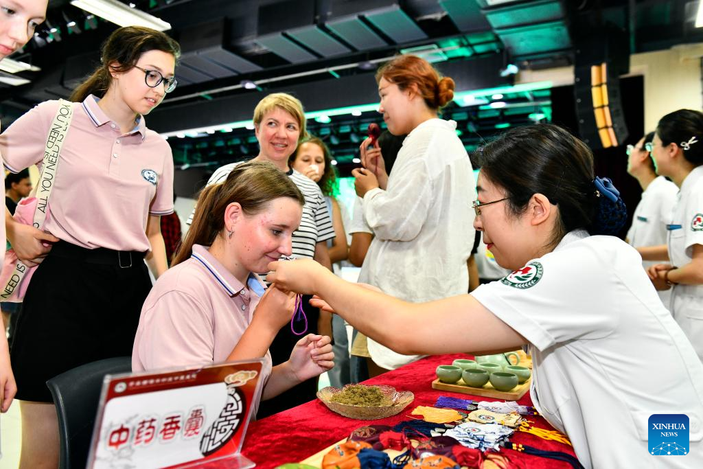 A foreign student learns to make Chinese medical sachet at the China University of Petroleum (East China) in Qingdao, east China's Shandong Province, July 20, 2023. China University of Petroleum (East China) has set up a traditional Chinese medicine (TCM) cultural experience center, where foreign students here can experience TCM diagnosis and treatment, TCM herbal tea, cupping, therapeutic scraping, Baduanjin excercises (a form of fitness Qigong), etc. (Xinhua/Li Ziheng)