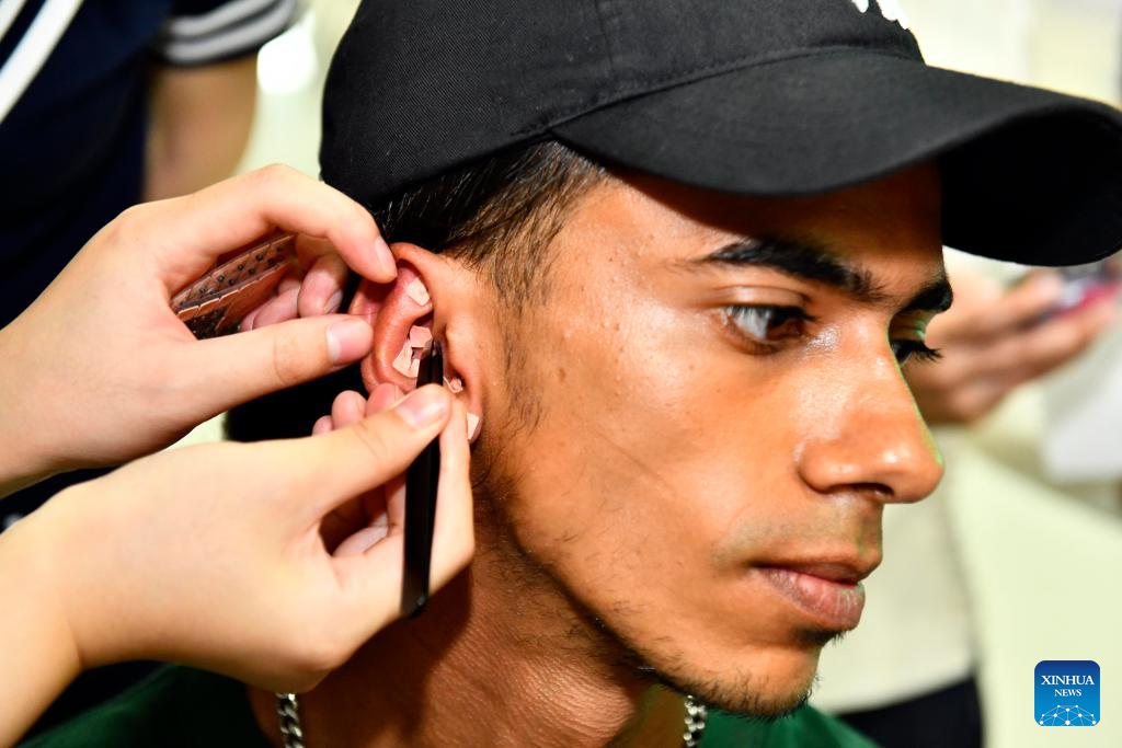 A foreign student experiences a traditional Chinese medical treatment on ears at the China University of Petroleum (East China) in Qingdao, east China's Shandong Province, July 20, 2023. China University of Petroleum (East China) has set up a traditional Chinese medicine (TCM) cultural experience center, where foreign students here can experience TCM diagnosis and treatment, TCM herbal tea, cupping, therapeutic scraping, Baduanjin excercises (a form of fitness Qigong), etc. (Xinhua/Guo Xulei)