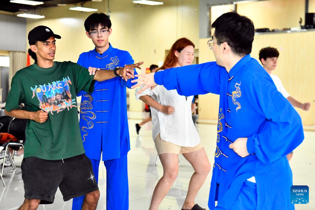 Medical staff guide foreign students on the practice of Baduanjin, a form of fitness Qigong, at the China University of Petroleum (East China) in Qingdao, east China's Shandong Province, July 20, 2023. China University of Petroleum (East China) has set up a traditional Chinese medicine (TCM) cultural experience center, where foreign students here can experience TCM diagnosis and treatment, TCM herbal tea, cupping, therapeutic scraping, Baduanjin excercises (a form of fitness Qigong), etc. (Xinhua/Li Ziheng)
