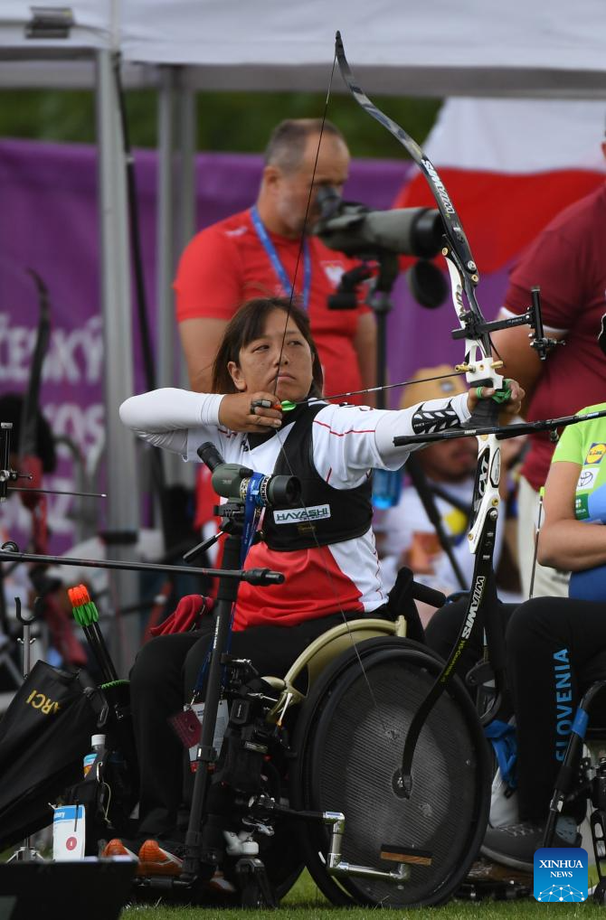 Japanese archer Shigesada Chika competes during the third round of the individual elimination matches of Recurve Women Open at 2023 World Archery Para Championships in Pilsen, the Czech Republic, July 20, 2023. (Xinhua/He Canling)
