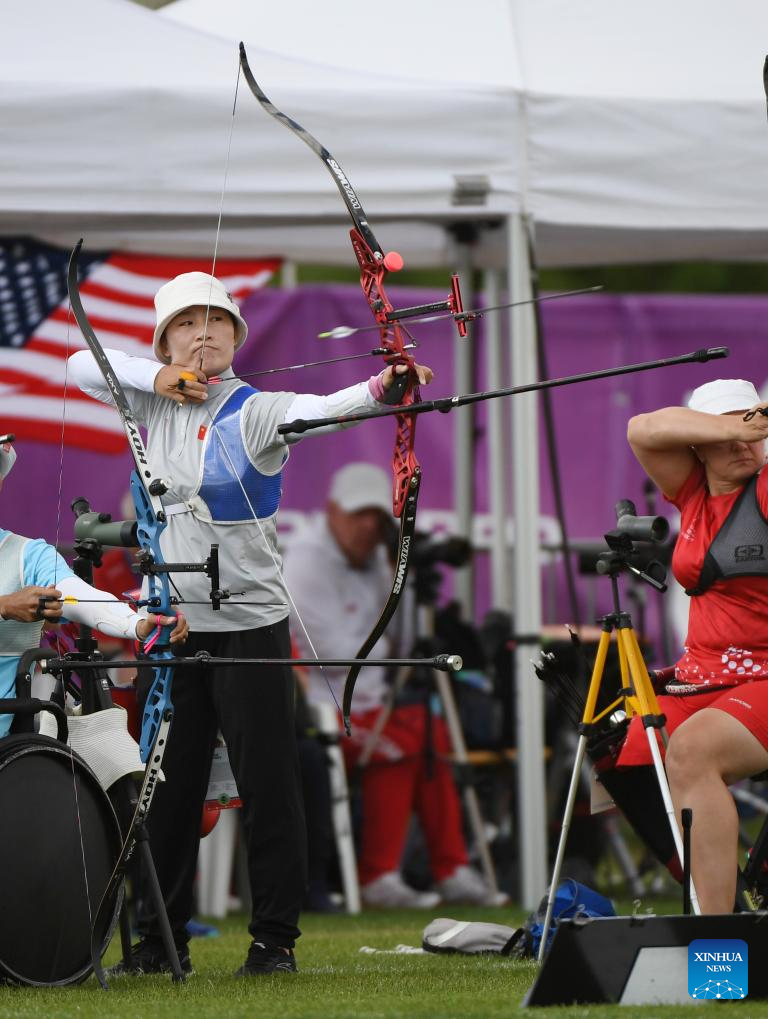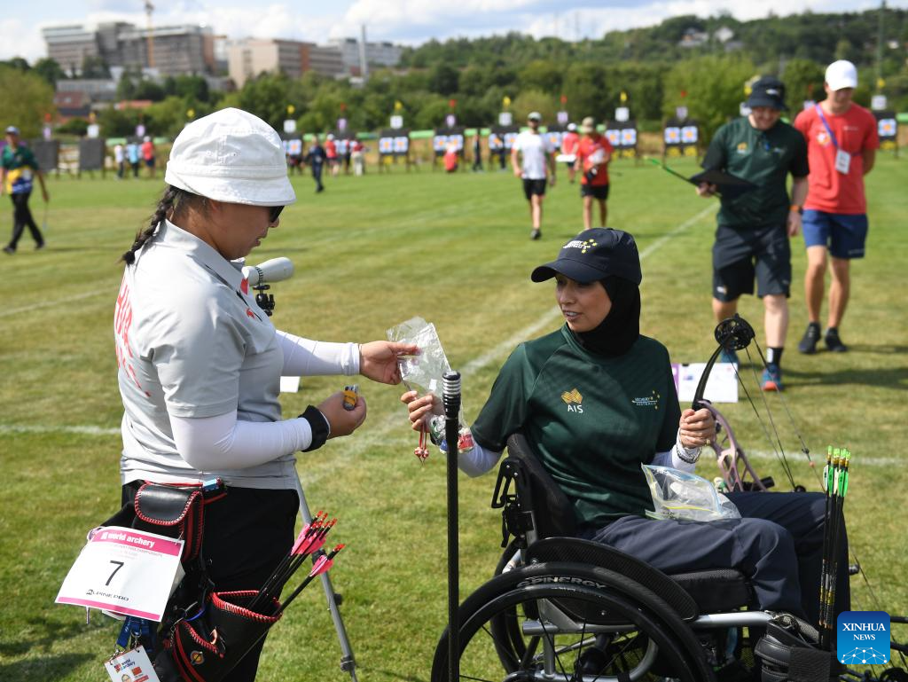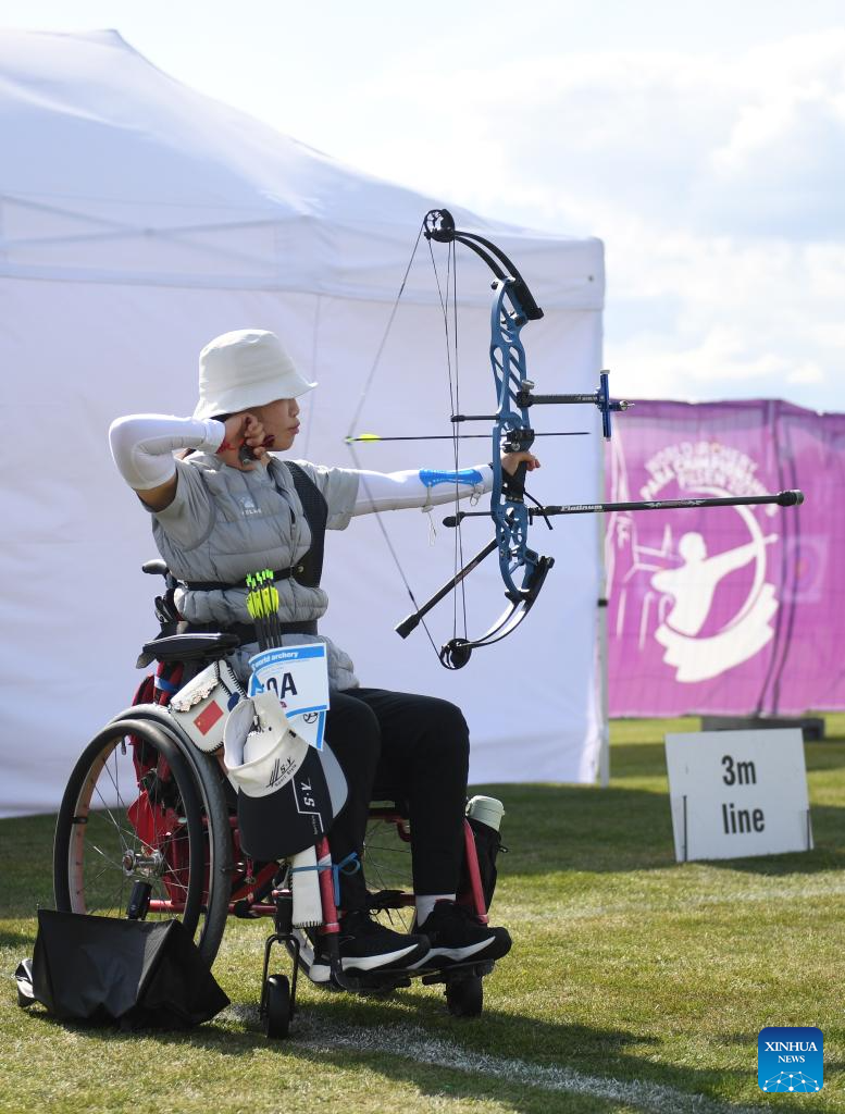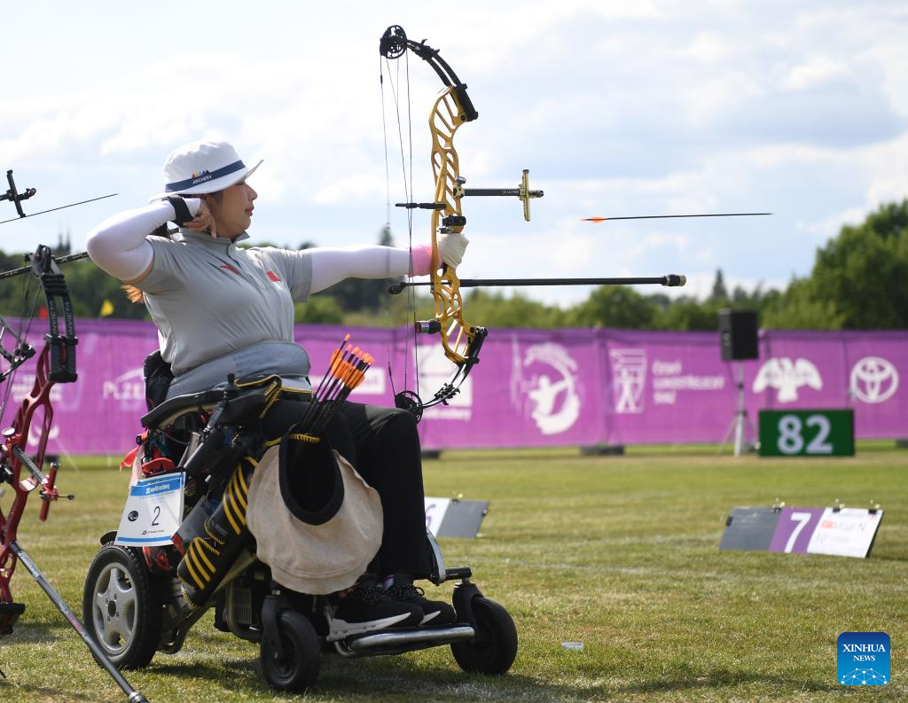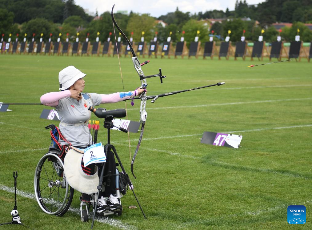 Chinese archer Chen Minyi competes during the quarterfinal of the Women W1(REC/COMP) at 2023 World Archery Para Championships in Pilsen, the Czech Republic, July 20, 2023. (Xinhua/He Canling)