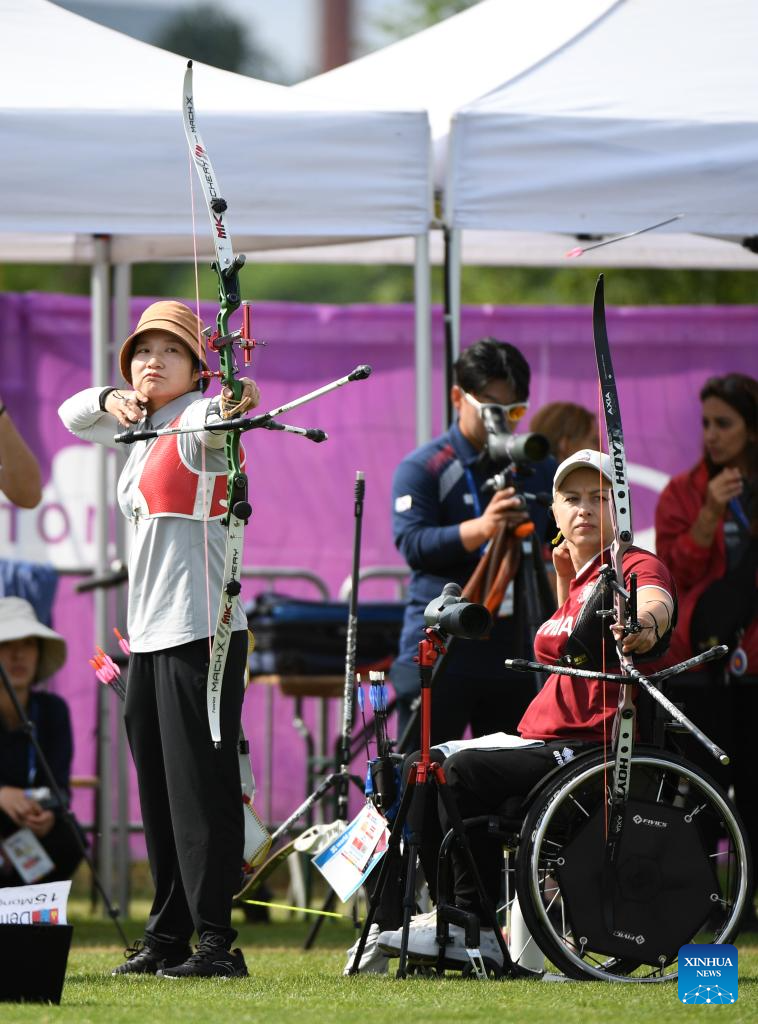 Chinese archer Ye Jinyan (Front, L) competes during the second round of the individual elimination matches of Recurve Women Open at 2023 World Archery Para Championships in Pilsen, the Czech Republic, July 20, 2023. (Xinhua/He Canling)