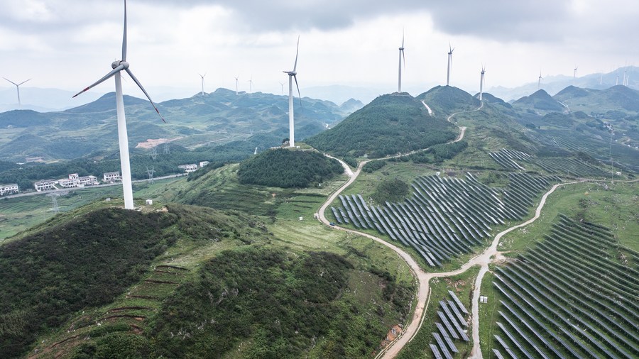 This aerial photo taken on July 6, 2023 shows a photovoltaic (PV) power plant in Ertang Town of Weining Yi, Hui and Miao Autonomous County, southwest China's Guizhou Province. (Xinhua/Tao Liang)