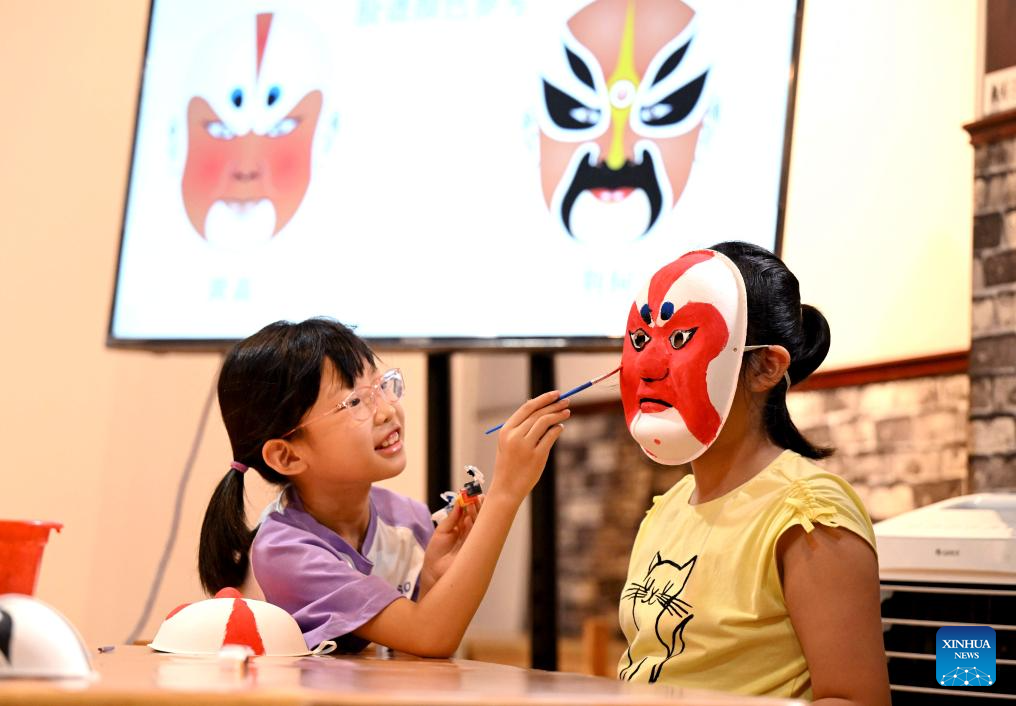Children learn the art of traditional Chinese opera facial makeup in Qiaoxi District of Shijiazhuang City, north China's Hebei Province, July 21, 2023. (Photo by Chen Qibao/Xinhua)