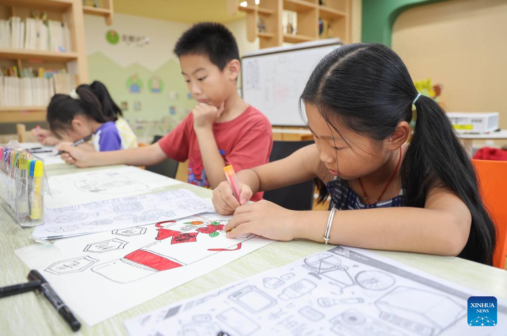 Children learn painting in Lanshan District of Linyi City, east China's Shandong Province, July 21, 2023. (Photo by Xu Chuanbao/Xinhua)