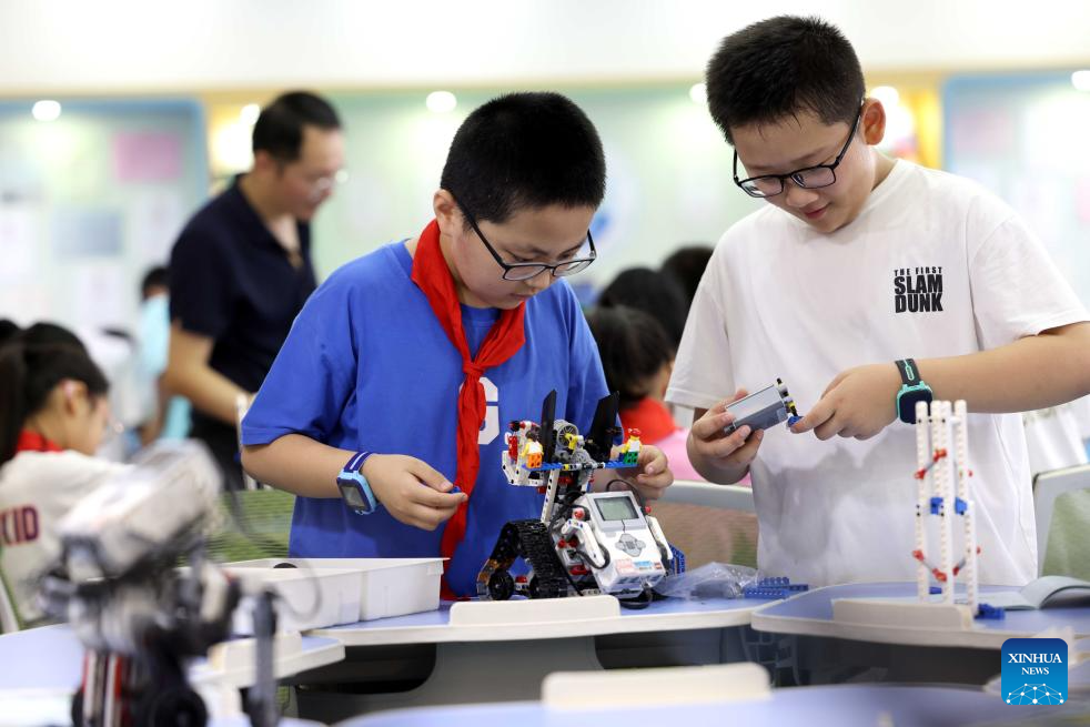 Children assemble a robot in Hefei, east China's Anhui Province, July 21, 2023. (Photo by Xie Chen/Xinhua)