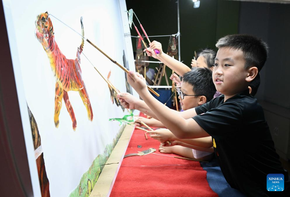 Children try maneuvering shadow puppets for a shadow play in Qiaoxi District of Shijiazhuang City, north China's Hebei Province, July 21, 2023. (Photo by Chen Qibao/Xinhua)
