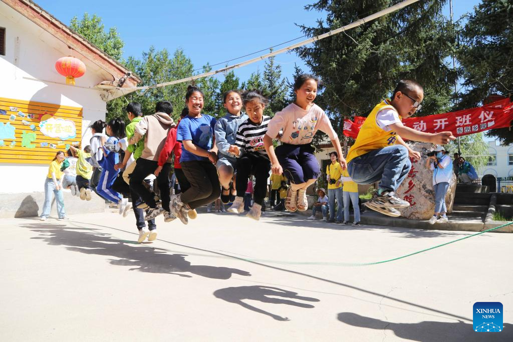 Children skip a rope in Dongyue Village of Anding District in Dingxi City, northwest China's Gansu Province, July 21, 2023. (Photo by Wang Kexian/Xinhua)