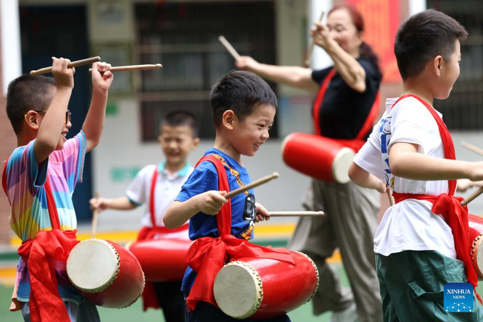 Children practice waist drum in Hefei, east China's Anhui Province, July 21, 2023. (Photo by Xie Chen/Xinhua)