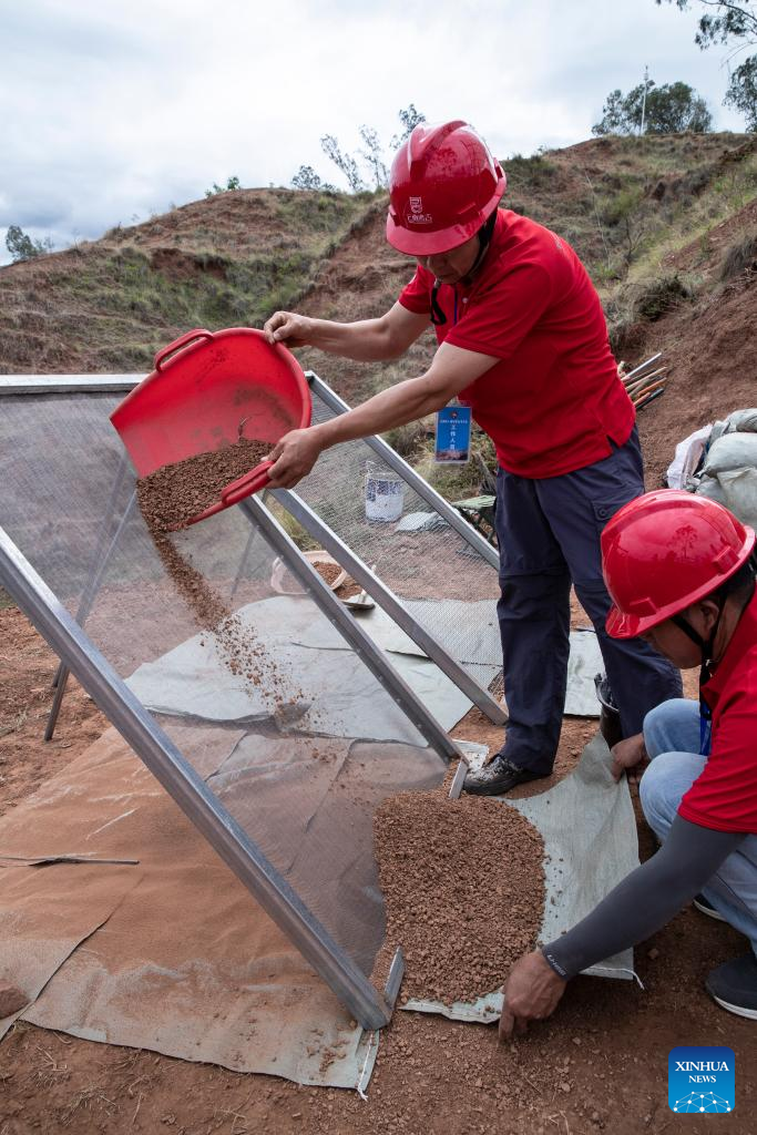 Staff workers screen excavated soil in Yuanmou County, southwest China's Yunnan Province, July 21, 2023.