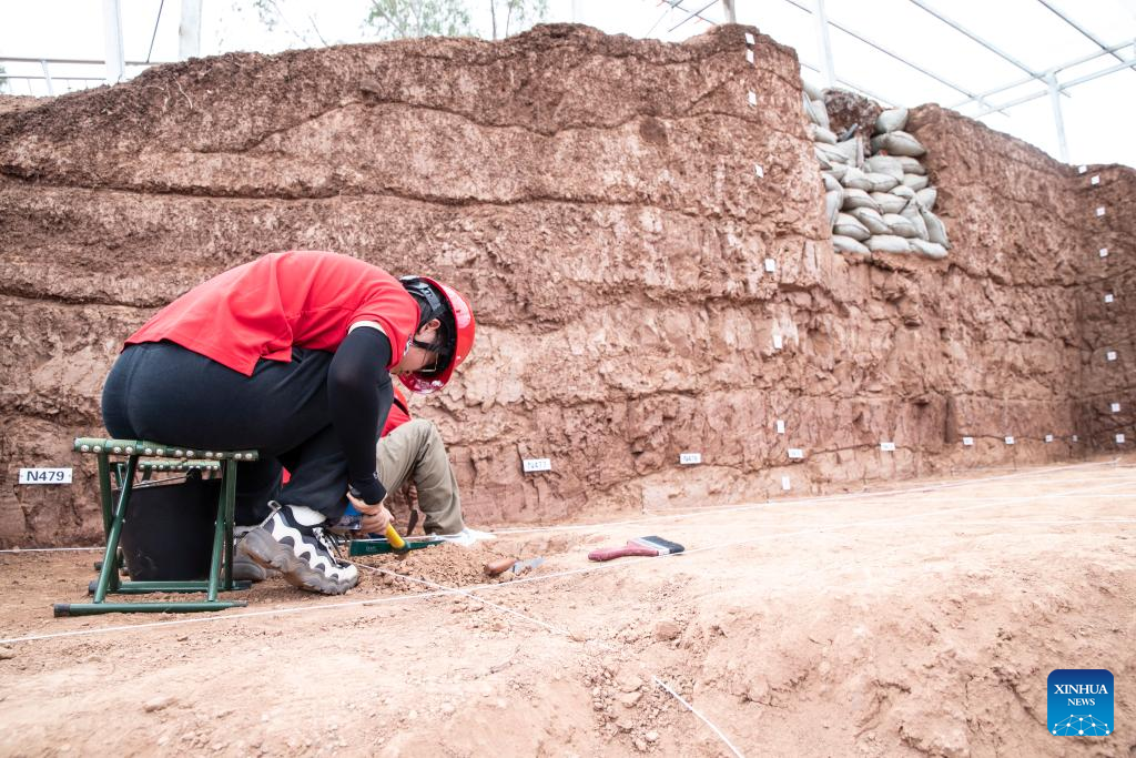 Staff workers conduct excavation work at Yuanmou ape-man site in Yuanmou County, southwest China's Yunnan Province, July 21, 2023.