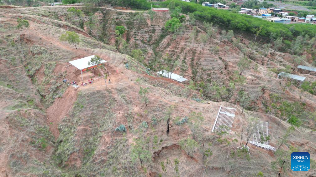 This aerial photo shows the Yuanmou ape-man excavation site in Yuanmou County, southwest China's Yunnan Province, July 21, 2023.