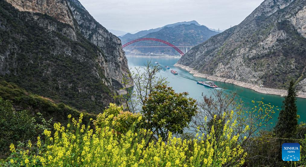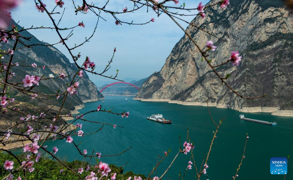 This photo taken on March 29, 2023 shows the scenery of Xiling Gorge, one of the Three Gorges on the Yangtze River, in central China's Hubei Province. Located in the upper reaches of the Yangtze River, the Three Gorges Reservoir area is an important ecological function zone and reservoir of freshwater resources in China.