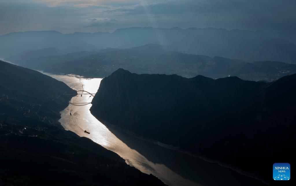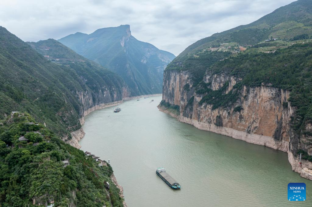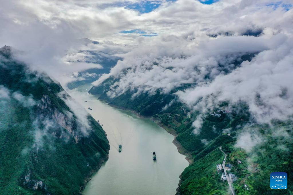 This aerial photo taken on July 1, 2023 shows the scenery of Qutang Gorge, one of the Three Gorges on the Yangtze River, in southwest China's Chongqing Municipality. Located in the upper reaches of the Yangtze River, the Three Gorges Reservoir area is an important ecological function zone and reservoir of freshwater resources in China.