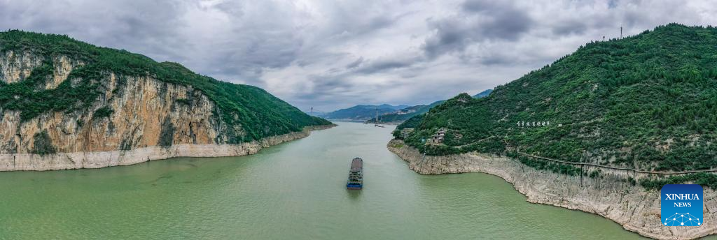 This aerial stitched photo taken on July 1, 2023 shows the scenery of Qutang Gorge, one of the Three Gorges on the Yangtze River, in southwest China's Chongqing Municipality. Located in the upper reaches of the Yangtze River, the Three Gorges Reservoir area is an important ecological function zone and reservoir of freshwater resources in China.