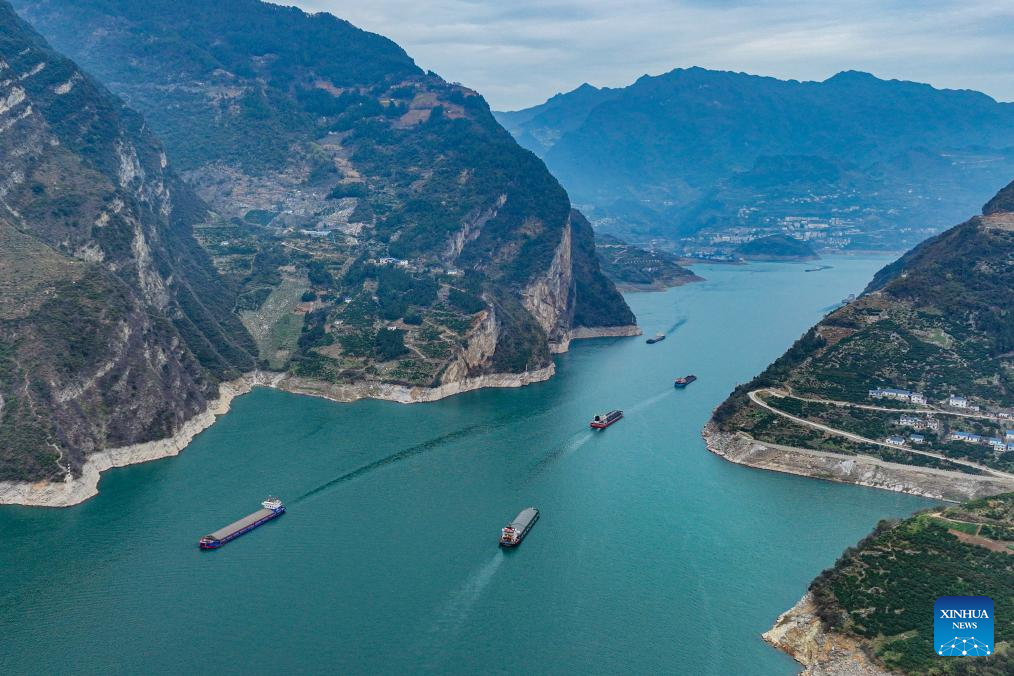 This photo taken on Jan. 25, 2023 shows the scenery of Xiling Gorge, one of the Three Gorges on the Yangtze River, in central China's Hubei Province. Located in the upper reaches of the Yangtze River, the Three Gorges Reservoir area is an important ecological function zone and reservoir of freshwater resources in China.
