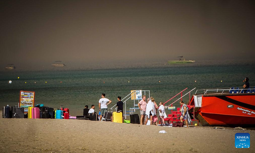 People wait to evacuate after a wildfire hit the Rhodes island in Greece, July 22, 2023. At least 2,000 residents and holidaymakers were evacuated by sea in the fire-stricken areas of Rhodes island in Greece on Saturday evening, authorities said. (Photo by Argiris Mantikos/Xinhua)
