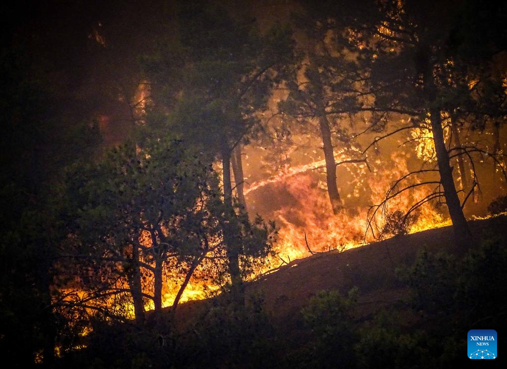 This photo taken on July 22, 2023 shows a massive wildfire raging the Rhodes island in Greece. At least 2,000 residents and holidaymakers were evacuated by sea in the fire-stricken areas of Rhodes island in Greece on Saturday evening, authorities said. (Photo by Argiris Mantikos/Xinhua)