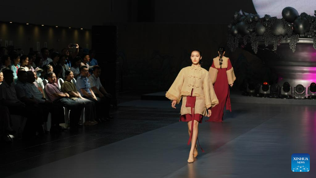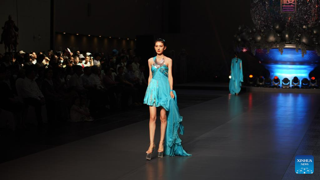 A model presents a creation during a fashion show on the sidelines of the 6th China Xinjiang International Dance Festival, in Urumqi, northwest China's Xinjiang Uygur Autonomous Region, July 22, 2023. (Xinhua/Zhang Xiaocheng)