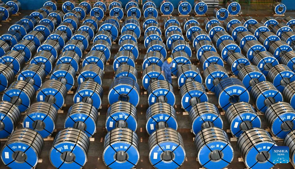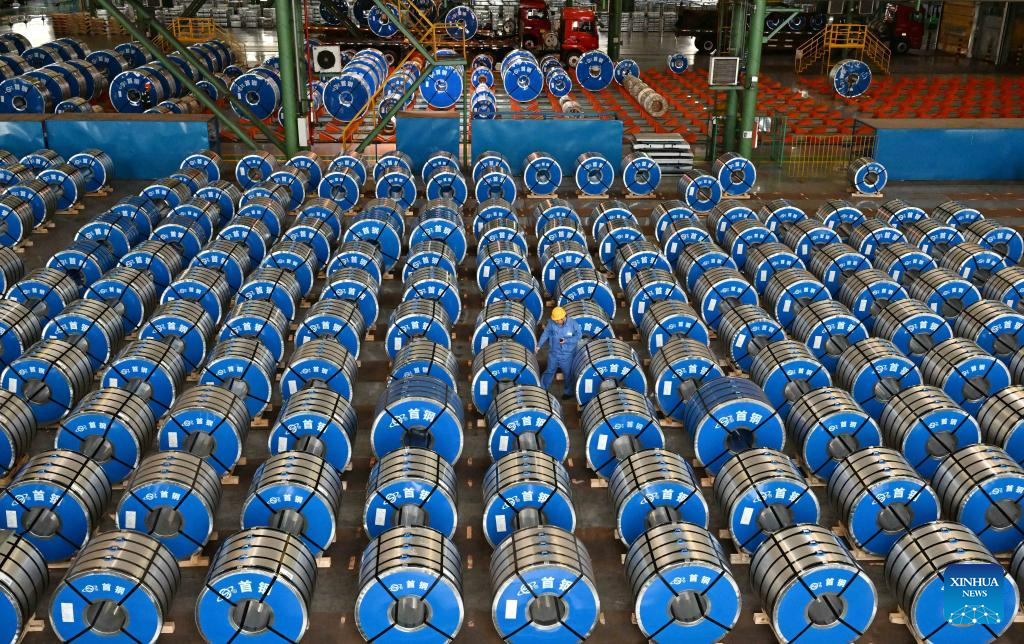 A staff member works at a warehouse of Shougang Jingtang United Iron &Steel Co., Ltd. in Tangshan, north China's Hebei Province, July 22, 2023. Tangshan has continued to promote the optimizing of steel industry in recent years, contributing to the high-quality development of the economy. (Xinhua/Zhu Xudong)
