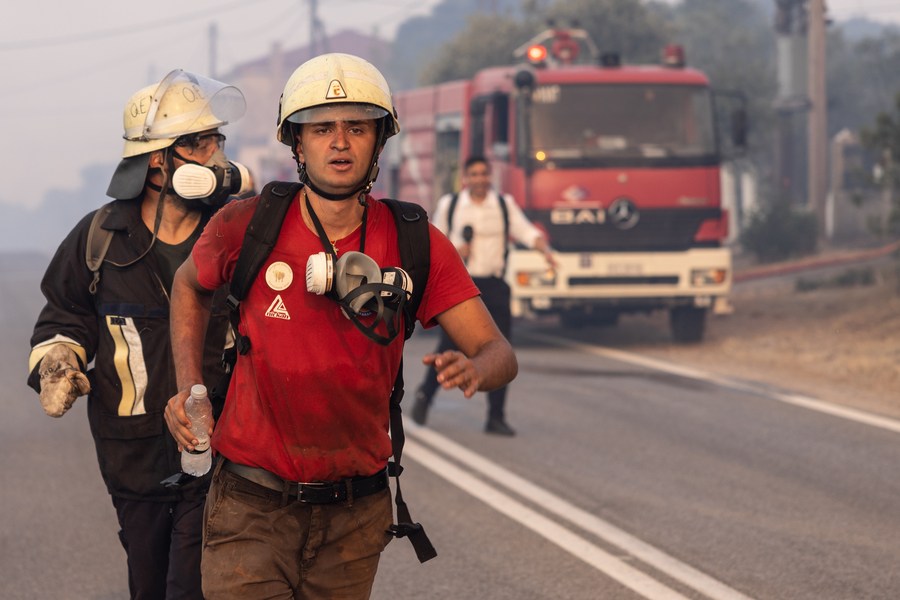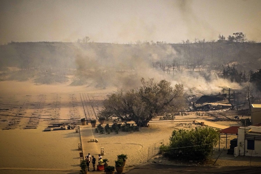 People wait to evacuate after a wildfire hit the Rhodes island in Greece, July 22, 2023. (Photo by Argiris Mantikos/Xinhua)