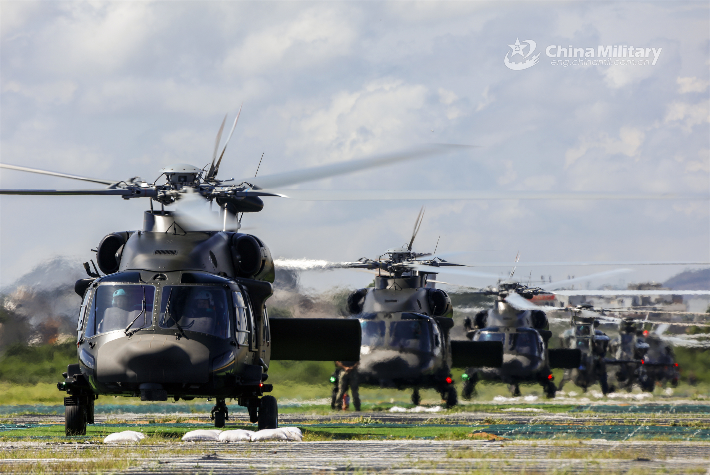 Multiple types of attack and transport helicopters attached to an army brigade prepare to lift off from the parking apron during a real-combat flight training mission on July 5, 2023. (eng.chinamil.com.cn/Photo by Zeng Xing)