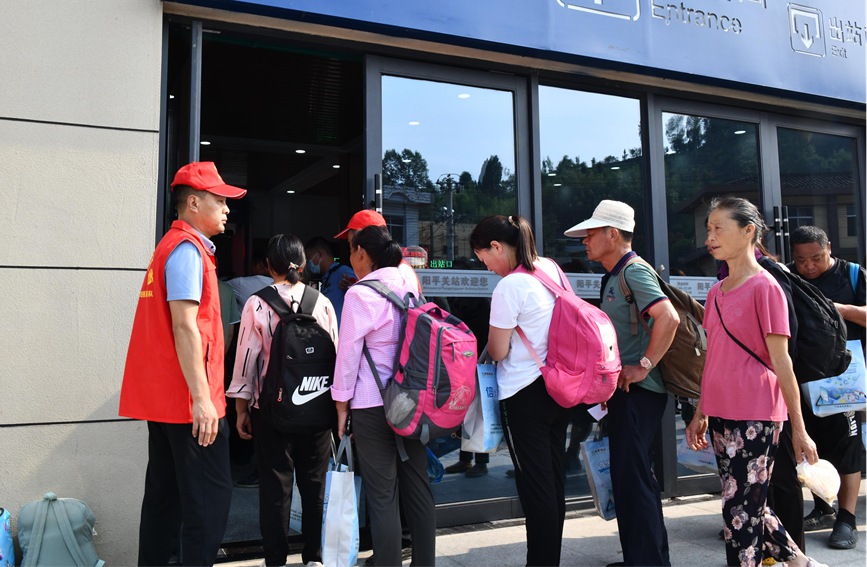 Farmers board a special train to Fengxian county, Baoji city, northwest China's Shaanxi Province, to pick Sichuan peppers to increase their income. The local railway operator has increased manpower to ensure good services for these passengers. (Photo/Chen Zhe)