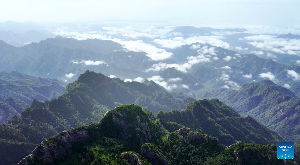 This aerial photo taken on July 21, 2023 shows cloud sea on Qinling Mountains seen from the Zhuque National Forest Park in Xi'an, northwest China's Shaanxi Province. The park, located in the upper reaches of the east Laohe river and in the north of Qinling Mountains, covers an area of 2,621 hectares, and its highest point Bingjing peak has an altitude of 3,015 meters. Amazing scenery such as virgin forest, glacier remains and cloud sea can be seen along the road to the peak. (Xinhua/Liu Xiao)