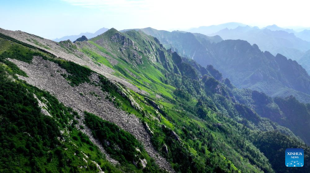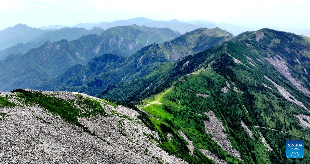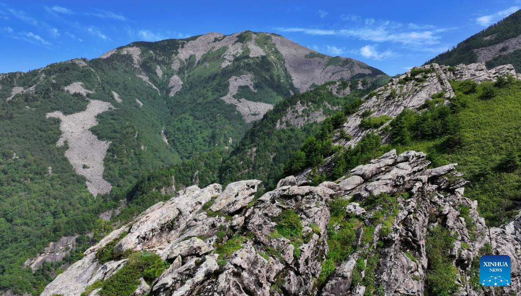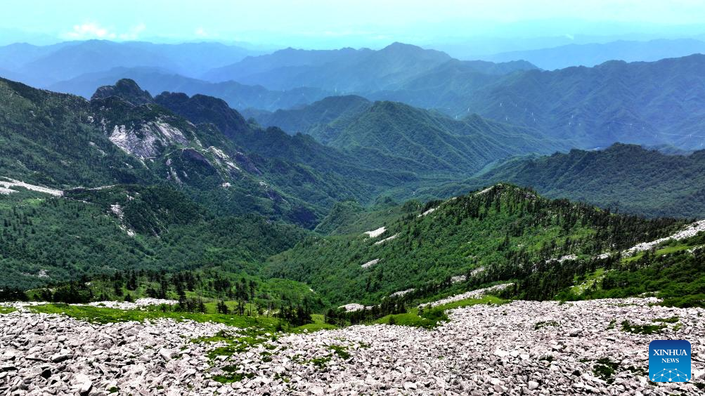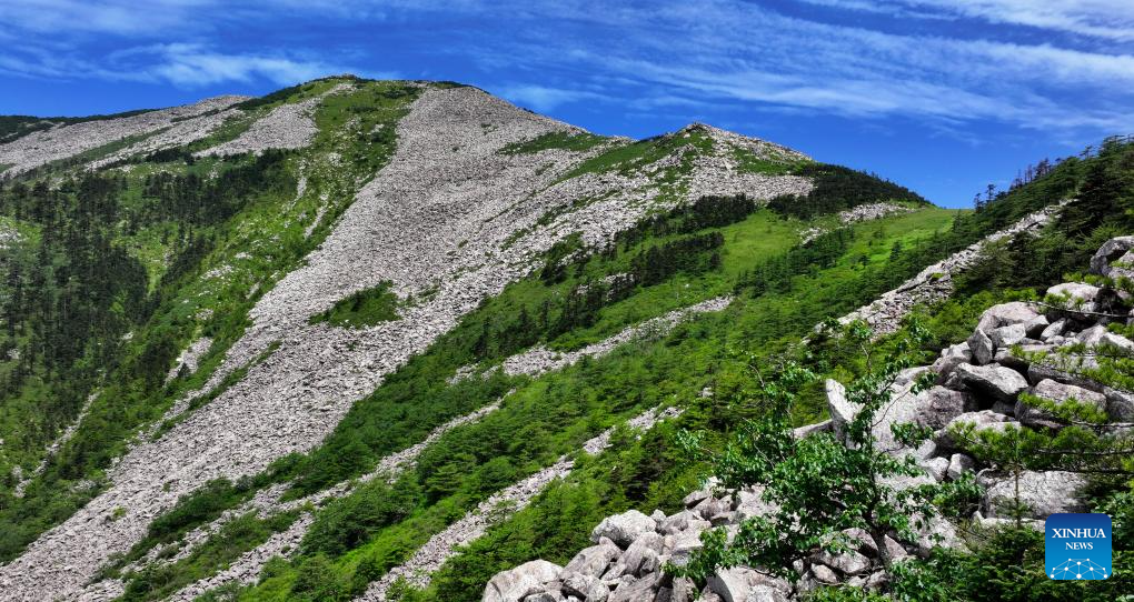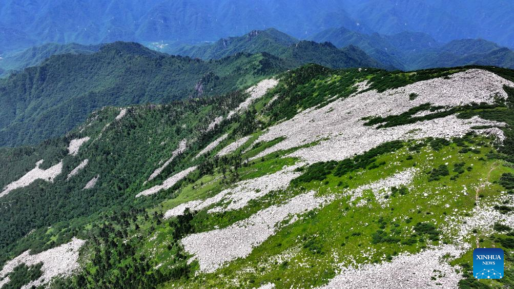 This aerial photo taken on July 21, 2023 shows rock sea and highland meadow at the Zhuque National Forest Park in Xi'an, northwest China's Shaanxi Province. The park, located in the upper reaches of the east Laohe river and in the north of Qinling Mountains, covers an area of 2,621 hectares, and its highest point Bingjing peak has an altitude of 3,015 meters. Amazing scenery such as virgin forest, glacier remains and cloud sea can be seen along the road to the peak. (Xinhua/Liu Xiao)