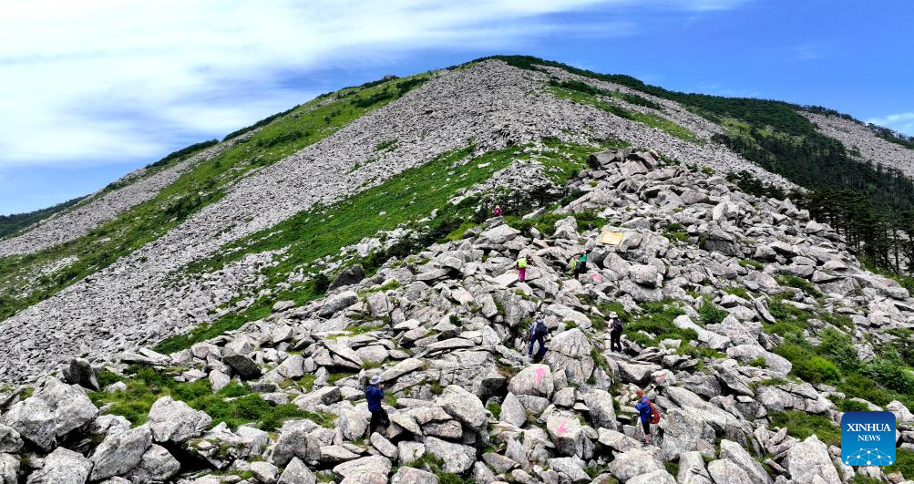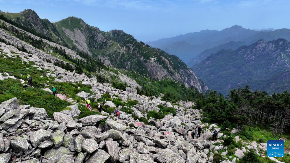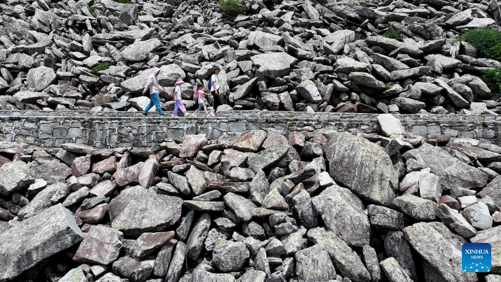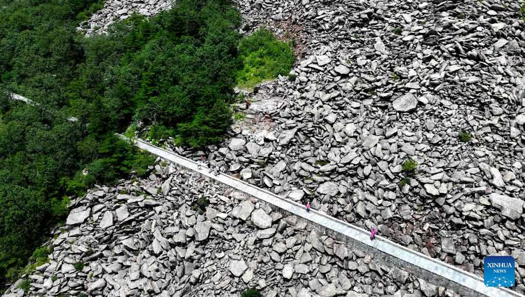 This aerial photo taken on July 21, 2023 shows visitors passing rock sea at the Zhuque National Forest Park in Xi'an, northwest China's Shaanxi Province. The park, located in the upper reaches of the east Laohe river and in the north of Qinling Mountains, covers an area of 2,621 hectares, and its highest point Bingjing peak has an altitude of 3,015 meters. Amazing scenery such as virgin forest, glacier remains and cloud sea can be seen along the road to the peak. (Xinhua/Liu Xiao)
