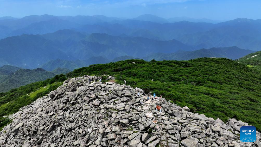 This aerial photo taken on July 21, 2023 shows visitors reaching the Bingjing peak, the highest point of the Zhuque National Forest Park in Xi'an, northwest China's Shaanxi Province. The park, located in the upper reaches of the east Laohe river and in the north of Qinling Mountains, covers an area of 2,621 hectares, and its highest point Bingjing peak has an altitude of 3,015 meters. Amazing scenery such as virgin forest, glacier remains and cloud sea can be seen along the road to the peak. (Xinhua/Liu Xiao)