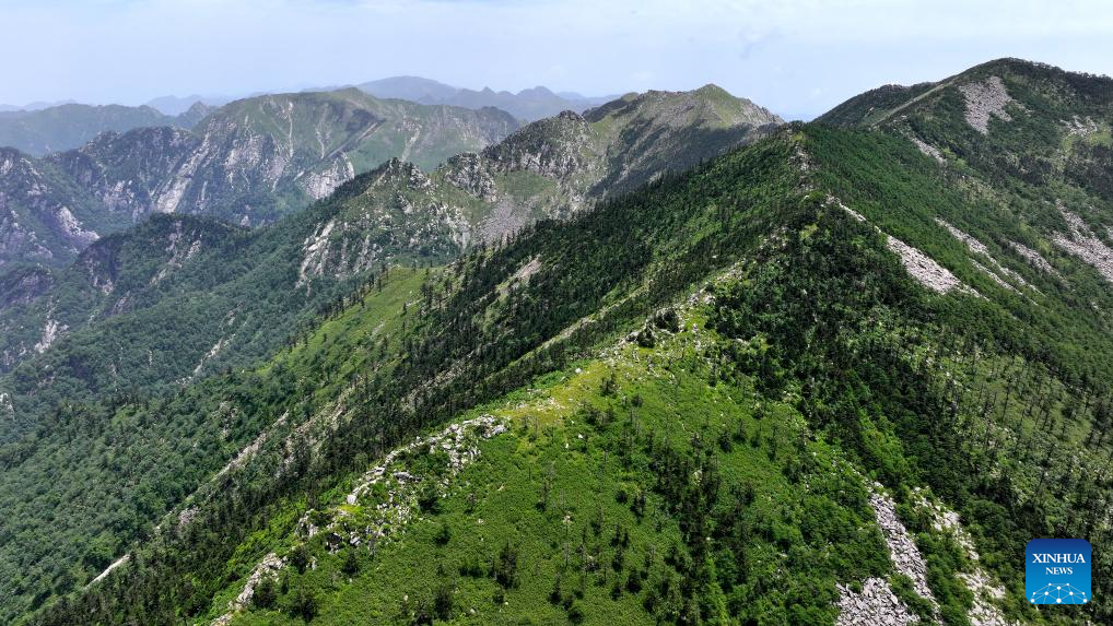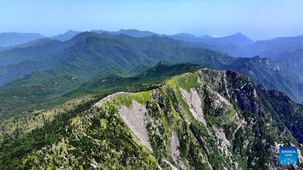 This aerial photo taken on July 21, 2023 shows the scenery at the Zhuque National Forest Park in Xi'an, northwest China's Shaanxi Province. The park, located in the upper reaches of the east Laohe river and in the north of Qinling Mountains, covers an area of 2,621 hectares, and its highest point Bingjing peak has an altitude of 3,015 meters. Amazing scenery such as virgin forest, glacier remains and cloud sea can be seen along the road to the peak. (Xinhua/Liu Xiao)