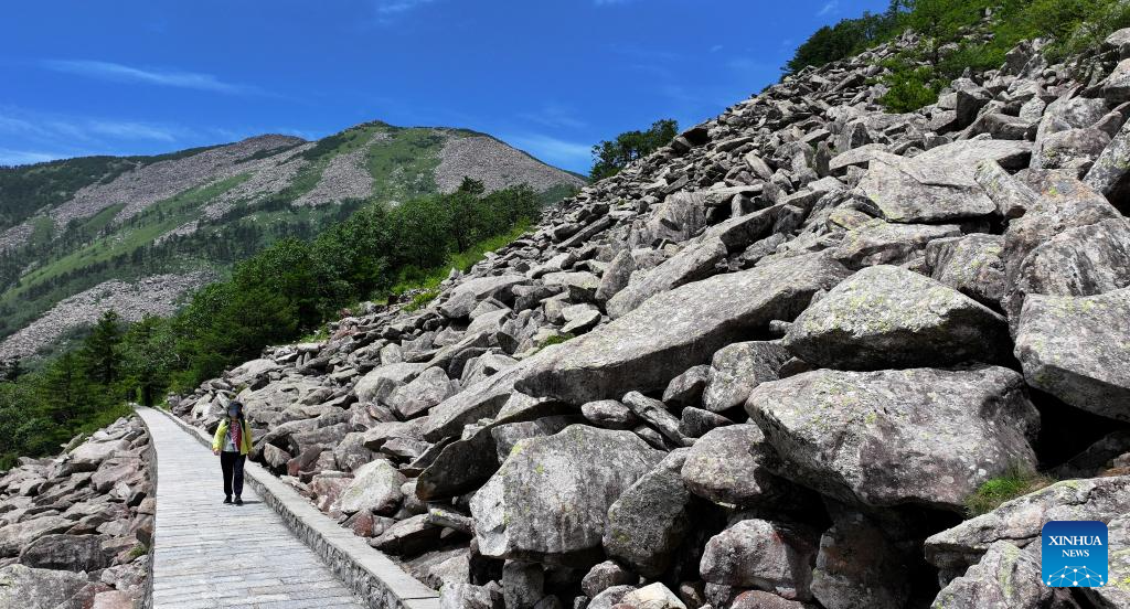 This aerial photo taken on July 21, 2023 shows a visitor passing rock sea at the Zhuque National Forest Park in Xi'an, northwest China's Shaanxi Province. The park, located in the upper reaches of the east Laohe river and in the north of Qinling Mountains, covers an area of 2,621 hectares, and its highest point Bingjing peak has an altitude of 3,015 meters. Amazing scenery such as virgin forest, glacier remains and cloud sea can be seen along the road to the peak. (Xinhua/Liu Xiao)