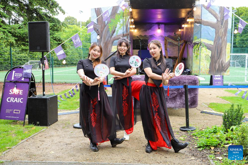 Girls perform traditional Chinese dance during an event of "Chinese Culture in a Van" in Dublin, Ireland, July 23, 2023. The annual event designed to promote the Chinese culture in Ireland was held in Dublin on Sunday, drawing hundreds of local residents. (Photo by Zhao Tianyu/Xinhua)
