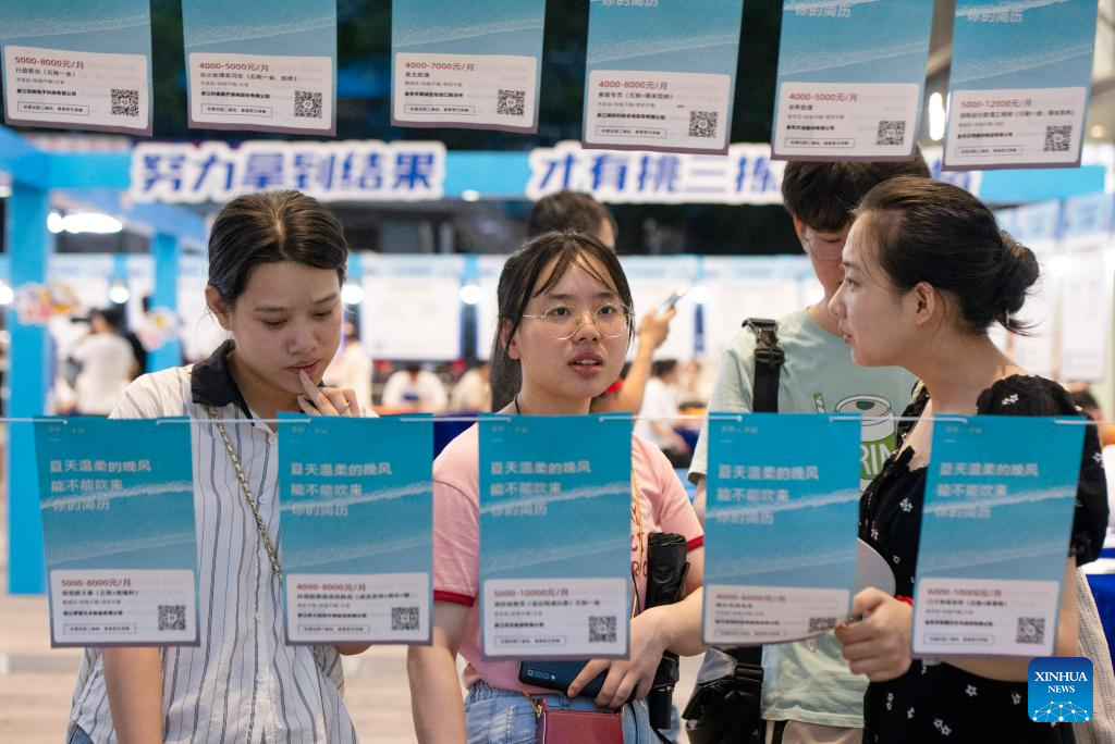 Job seekers read recruitment information at a job fair for college graduates in Jinhua City, east China's Zhejiang Province, July 21, 2023. (Photo by Shi Kuanbing/Xinhua)