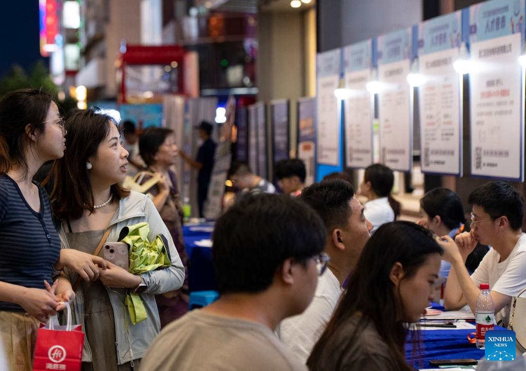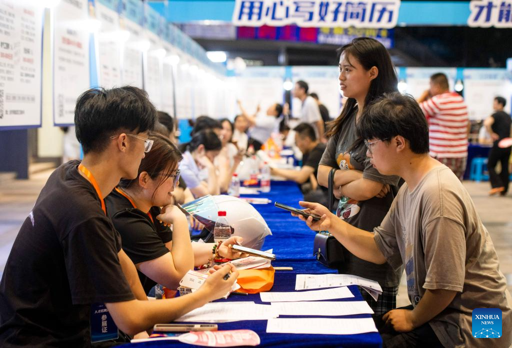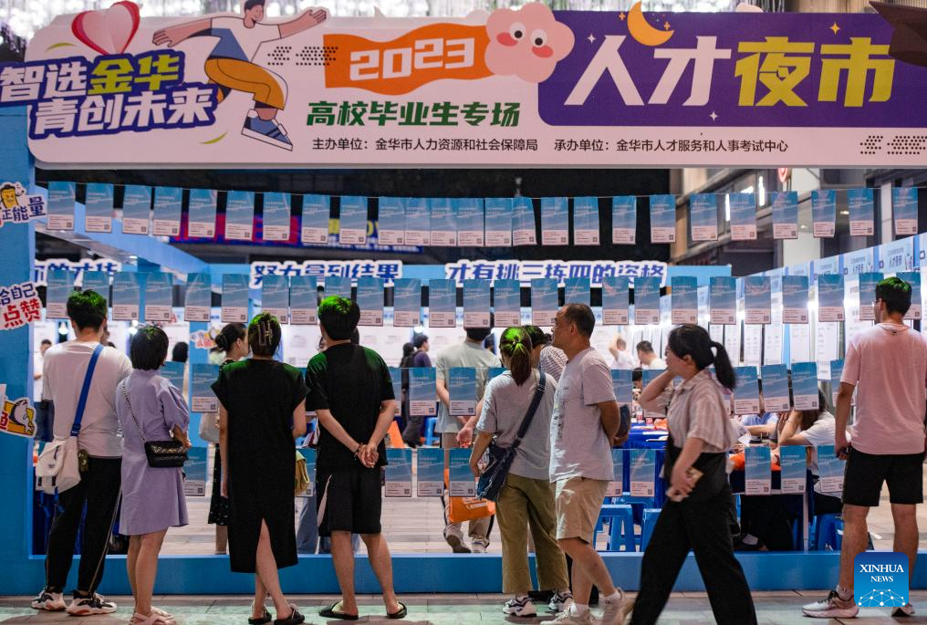 Job seekers inquire about job opportunities at a job fair for college graduates in Jinhua City, east China's Zhejiang Province, July 21, 2023. (Photo by Shi Kuanbing/Xinhua)
