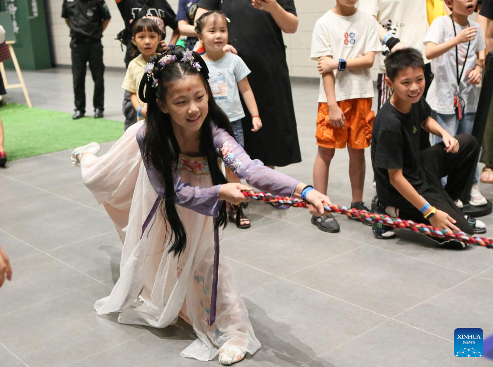 Children take part in a traditional tug-of-war game at a night fair at Minhang Museum of Shanghai in east China to experience the traditional Mongolian custom, July 21, 2023. The night fair was held on the sidelines of an exhibition featuring bronze ware from the city of Ordos, north China's Inner Mongolia Autonomous Region. (Xinhua/Xin Mengchen)