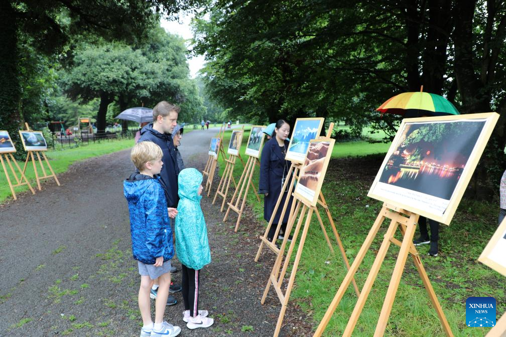 People view a photo exhibition during an event of "Chinese Culture in a Van" in Dublin, Ireland, July 23, 2023. The annual event designed to promote the Chinese culture in Ireland was held in Dublin on Sunday, drawing hundreds of local residents. (Photo by Liu Xiaoming/Xinhua)