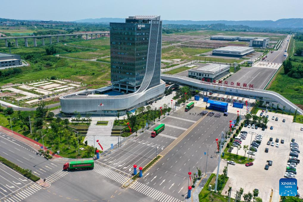 This aerial photo taken on July 11, 2023 shows trucks carrying auto parts of the Great Wall Motor Company Limited departing from the Chongqing Yongchuan Comprehensive Bonded Zone in southwest China's Chongqing Municipality to export to Thailand and Ecuador. (Xinhua/Tang Yi)