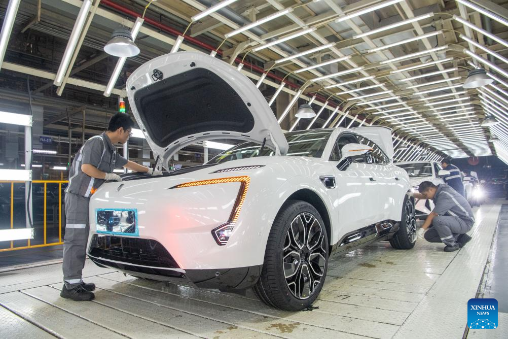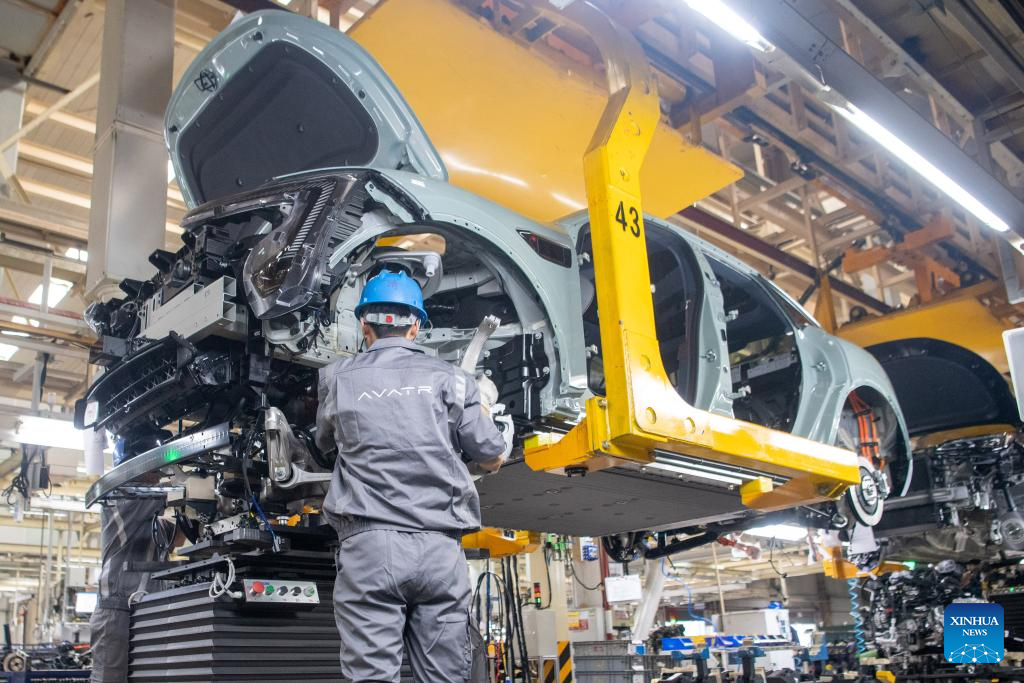 Workers are busy at a production line of the new energy vehicle AVATR at a workshop of Chang'an Auto in Jiangbei District, southwest China's Chongqing Municipality, July 20, 2023. (Xinhua/Li Qianlei)