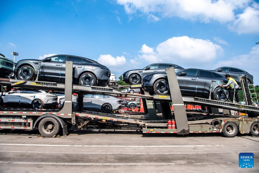 New energy vehicles AVATR are transported by trucks at a vehicle distribution center of Chang'an Auto in Jiangbei District, southwest China's Chongqing Municipality, July 20, 2023. (Xinhua/Tang Yi)
