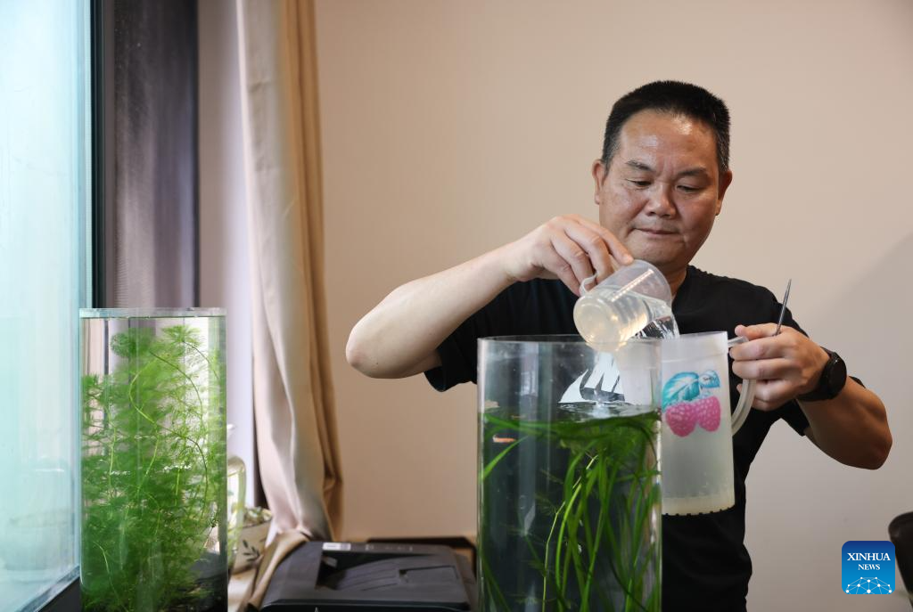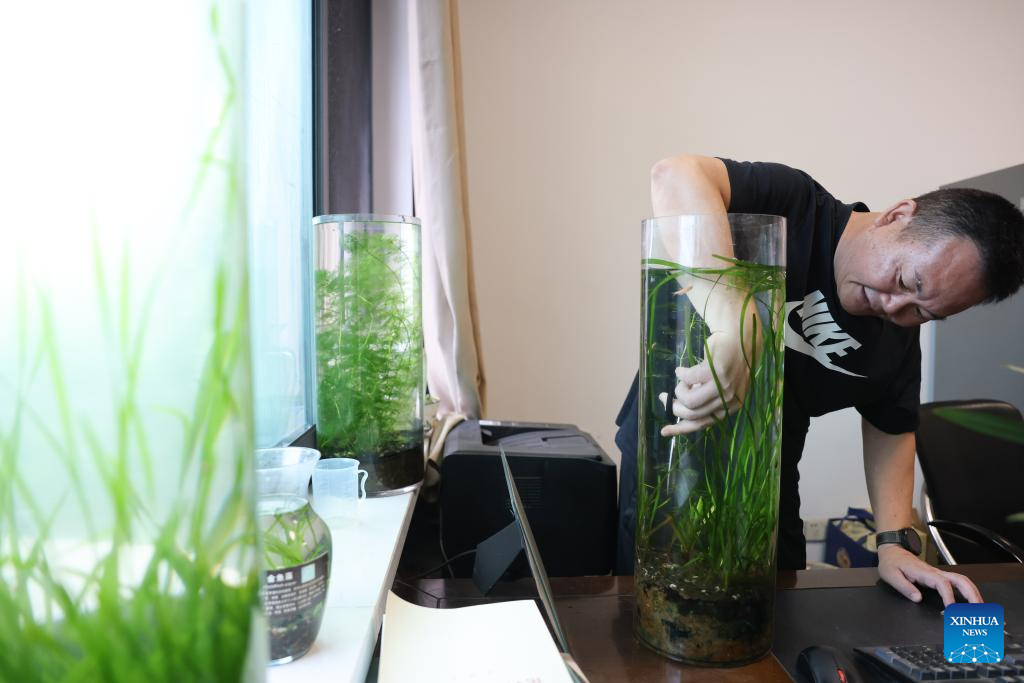 Xie Yonghong takes care of submerged plants at an office of the Institute of Subtropical Agriculture of the CAS in Changsha, central China's Hunan Province, July 8, 2023. (Xinhua/Xue Yuge)