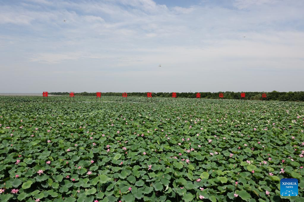 This photo taken on July 10, 2023 shows lotus of the Datong Lake in Yiyang, central China's Hunan Province. Located on the central region of the Dongting Lake, Datong Lake is known as "the heart of the Dongting Lake". (Xinhua/Jin Liwang)