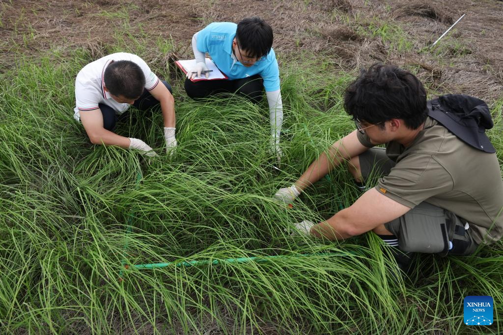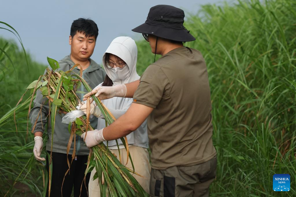 Doctor Zou Yeai (L), a member of the Dongting Lake Station for Wetland Ecosystem Research under the CAS, collects sedge samples with students in the east Dongting Lake nature reserve, central China's Hunan Province, July 9, 2023. (Xinhua/Xue Yuge)
