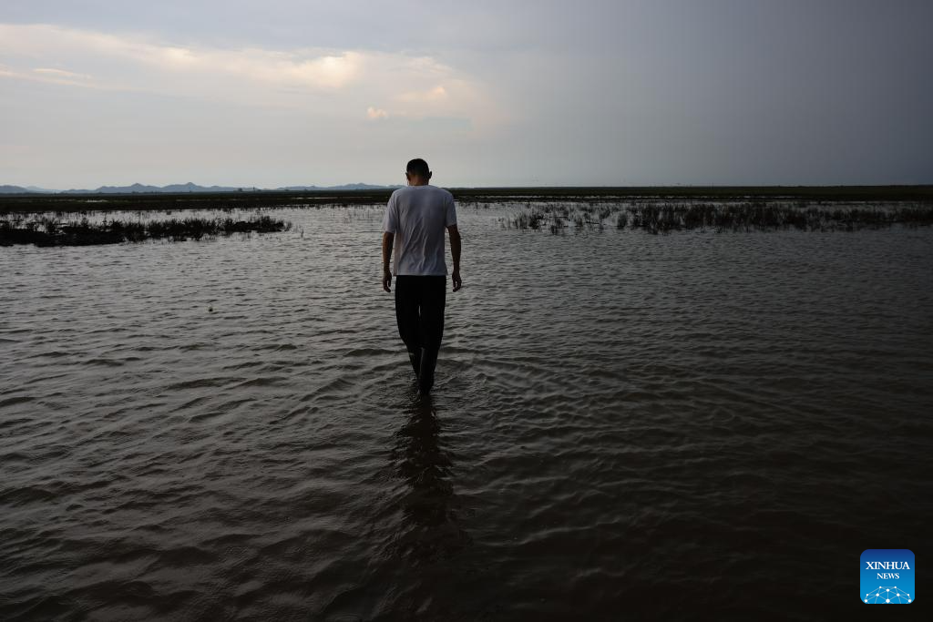 Doctor Zou Yeai, a member of the Dongting Lake Station for Wetland Ecosystem Research under the CAS, takes photos of the east Dongting Lake nature reserve in central China's Hunan Province, July 9, 2023. (Xinhua/Jin Liwang)
