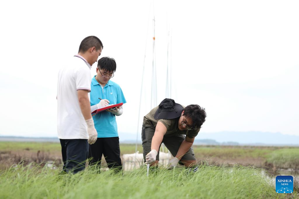 Members of the Dongting Lake Station for Wetland Ecosystem Research under the CAS measure the length of a plant sample in the east Dongting Lake nature reserve, central China's Hunan Province, July 9, 2023. (Xinhua/Jin Liwang)
